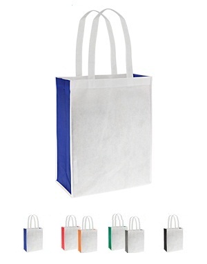 Bolsa Ecológica bicolor modelo "Moon", en tela TNT blanca y fuelle de color, 100% reciclable y reutilizable. Cuenta con 2 asas de 56 cm. c/u aprox.